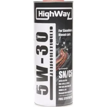 HighWay 5W-30 SN/CF синтетична моторна олія - призначена для бензинових та дизельних двигунів усіх типів, у тому числі обладнаних системами турбонаддуву. Має оптимальні низькотемпературні характеристики і високі антиокислювальні властивості, забезпечує легкий запуск і надійну роботу двигуна за будь-яких умов експлуатації. Переваги: високий рівень антиокислювальних та антифрикційних властивостей; максимальний захист двигуна від зносу у жорстких умовах міського циклу; сприяє зниженню витрати палива та забезпечує надійний захист двигуна від корозії та зносу. Відповідає вимогам: SAE 5W-30 API SN/CF MB 229.51 VW 502.00/505.00 BMW Longlife-04 Торгова марка HighWay належить міжнародній торговельно-промисловій асоціації Delfin Group, яка здійснює виробництво мастильних матеріалів на чотирьох виробничих майданчиках. та Україні та постачає свою продукцію більш ніж у тридцять країн світу. У 2010 році торговельну марку HighWay було виведено на ринок США компанією Delfin Group USA. На початковому етапі випускалися тільки охолоджувальні рідини, зараз лінійка продуктів під торговою маркою HighWay включає масла для двох- і чотиритактних двигунів, рідини для автоматичних трансмісій і гідропідсилювача керма, антифризи G11 і G12+.З 2013 року повний асортимент олій та антифризів HighWay представлений на ринках Європейського Союзу та СНД, що дозволяє українським та європейським споживачам оцінити високу якість продукції, що базується на передових виробничих технологіях та високоякісних сировинних компонентах. Співпраця зі світовими виробниками базових масел і присадок, постійний і ретельний контроль якості всіх компонентів, що використовуються, дозволяють забезпечити високу, а головне, стабільно високу якість мастильних матеріалів під торговою маркою HighWay і повну відповідність вимогам міжнародних стандартів і специфікаціям світових автовиробників.